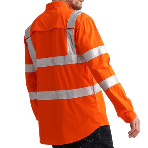 Hi Vis Mens Cotton Drill Rail Work Shirt – VIC Compliant H-Pattern Reflective, UPF 50+ | Wholesale